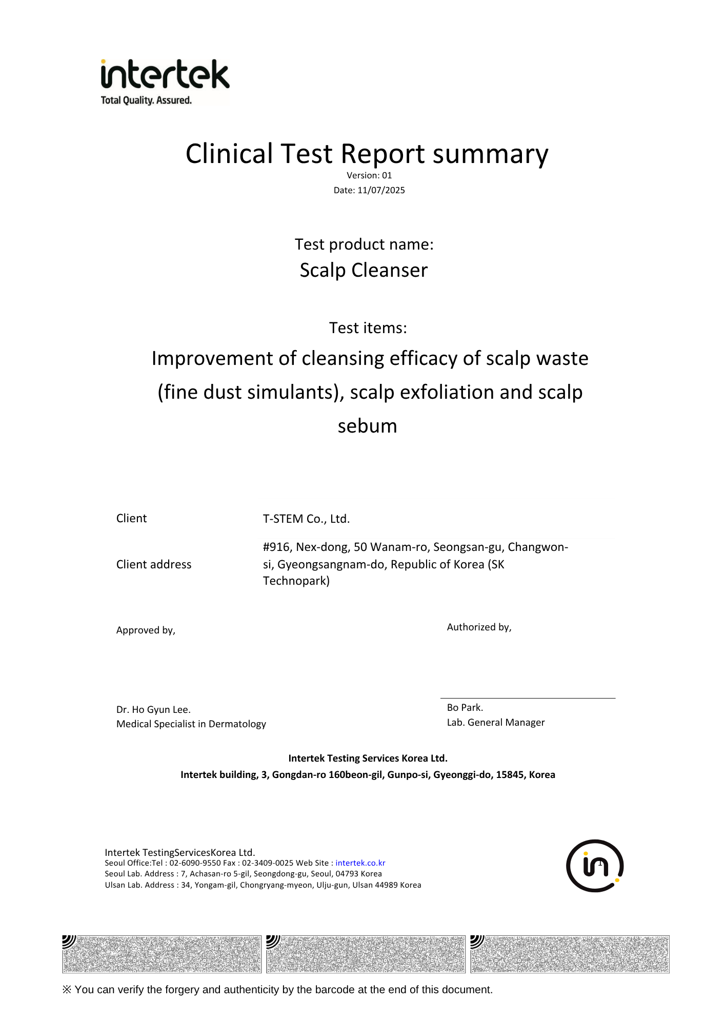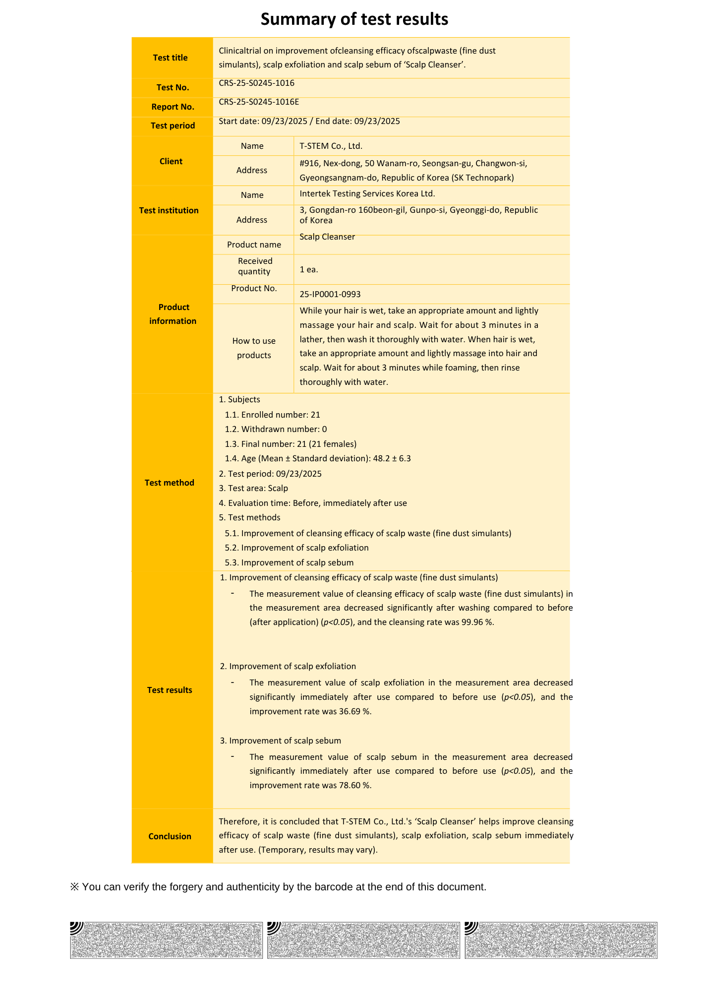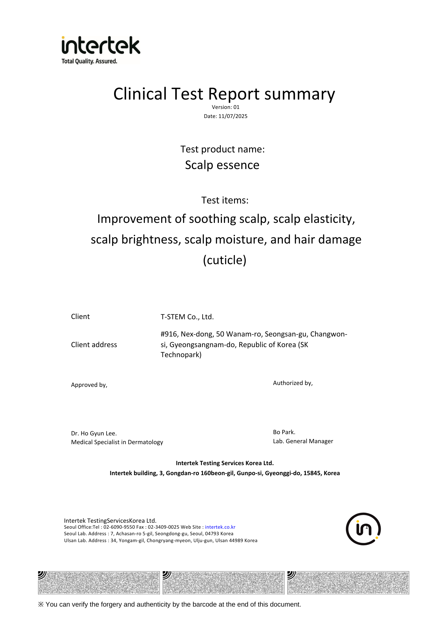 T-Stem Care’s Scalp Cleanser and Scalp Essence have undergone independent clinical testing conducted by Intertek Testing Services Korea, with oversight from a medical specialist in dermatology. These results confirm our commitment to science-first scalp care rooted in measurable performance and clean formulations.